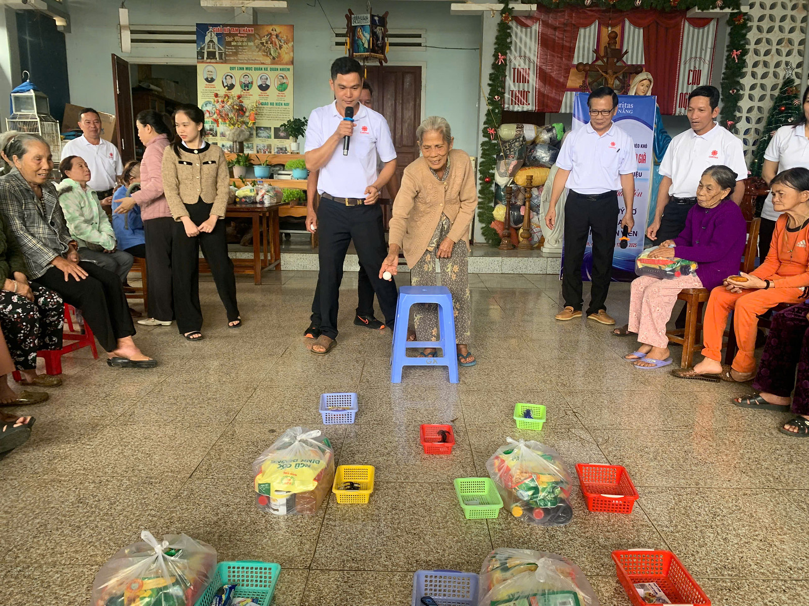 Trong phần sinh hoạt chung, dưới sự hướng dẫn của anh Nguyễn Văn Tín – hội viên tình nguyện Giáo họ Tam Lộc, các cụ cùng tham gia trò chơi ném bóng nhận thưởng. Dù việc di chuyển khó khăn, động tác chậm và yếu, nhưng gương mặt các cụ rạng rỡ niềm vui; những nếp nhăn dường như dịu lại trong bầu khí ấm áp tình người.
