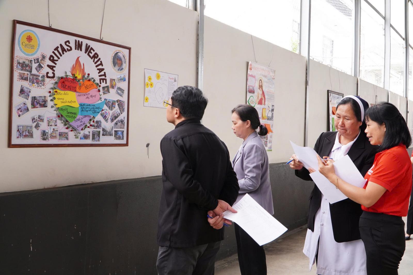 Phần thi làm báo tường - noi gương Thánh Têrêsa Calcutta là một trong những điểm nhấn sống động trong chương trình mừng bổn mạng Caritas năm nay. Cuộc thi đã tạo nên một không gian sáng tạo đầy sắc màu, nơi mà từng giáo xứ thể hiện sự hiểu biết sâu sắc về Thánh Têrêsa. Từng nét chữ, từng hình vẽ đều chứa đựng tình yêu và sự kính trọng với Mẹ Thánh, người đã hy sinh cả cuộc đời để phục vụ những con người bị lãng quên. Những tờ báo không chỉ đơn thuần là những bài thi, mà là những trang nhật ký của lòng trung thành và sự dấn thân không mệt mỏi của Caritas trong việc tiếp bước Thánh nhân. Nhìn ngắm những bức tranh và lắng nghe phần thuyết trình của các đội, ta như thấy bóng hình Mẹ hiện diện, như nghe thấy lời Mẹ thủ thỉ: “Chúng ta hãy gặp nhau trong nụ cười, vì nụ cười là khởi đầu của tình yêu.”