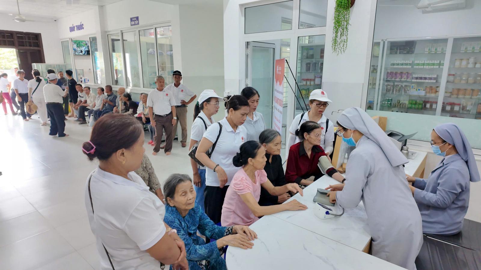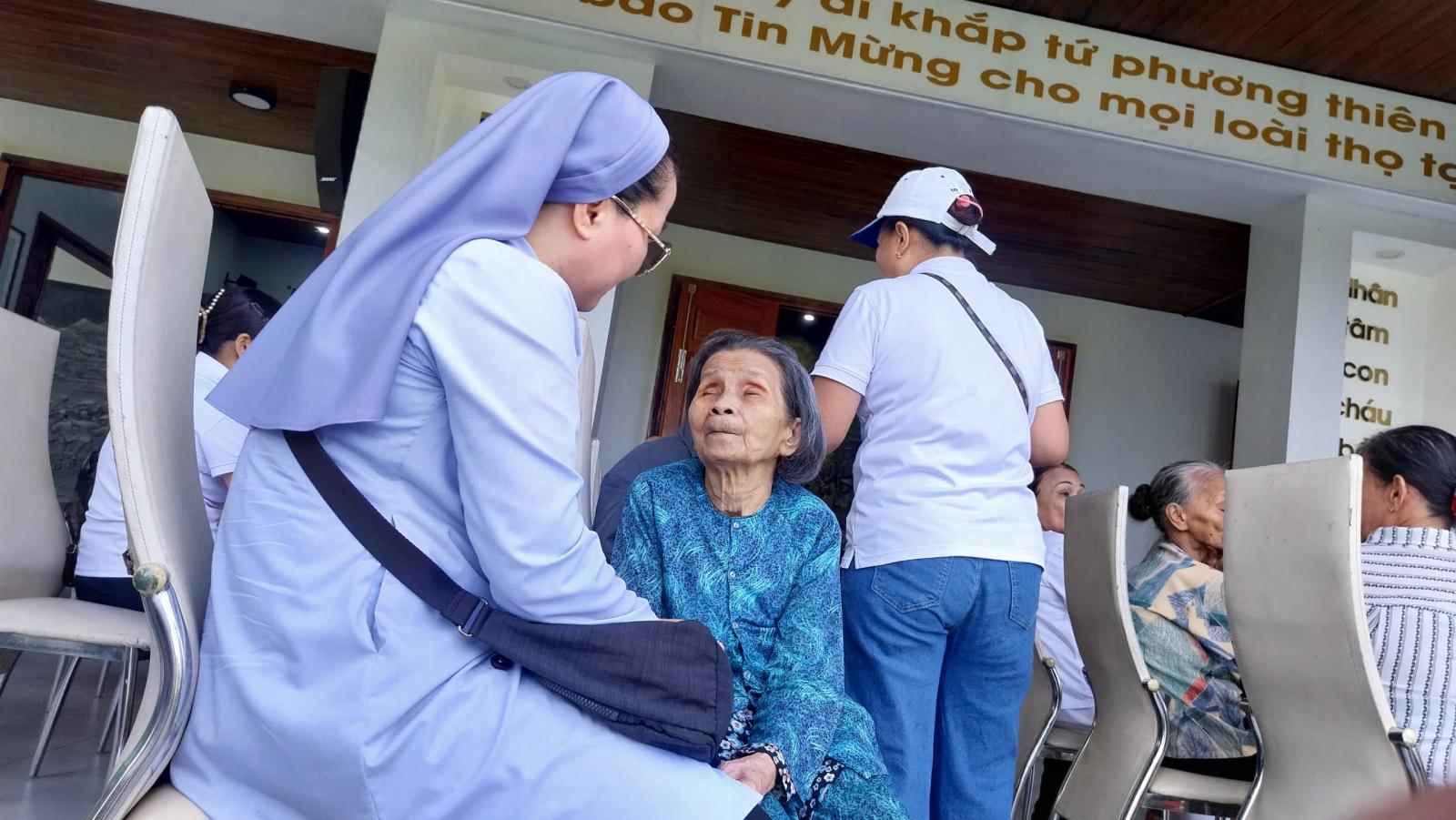 9g00, các cụ được đi khám bệnh và lấy thuốc bên phòng khám của các sơ Phaolô, ai nấy đều hớn hở vui mừng. Niềm vui ấy được diễn tả qua chia sẻ của cụ Đồng thuộc Giáo xứ Thạch Nham. Cụ mạnh dạn cầm micro dõng dạc: “Tôi cũng như quý ông bà ở đây rất hân hạnh được ở đây, được Caritas giúp đỡ, được nhận thuốc miễn phí. Chúng tôi rất cảm ơn, xin chúc sức khỏe đến mọi người trong toàn giáo phận Đà Nẵng…”