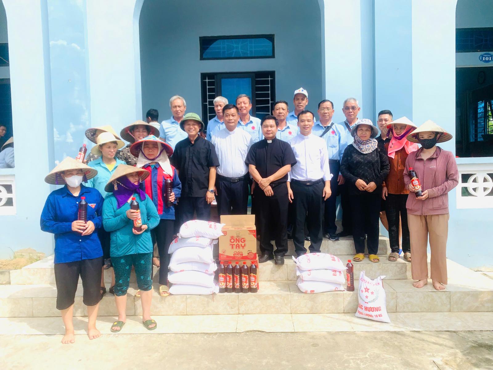Quý cha và các thành viên đã thăm hỏi và chia sẻ với bà con những phần quà là các nhu yếu phẩm. Đón nhận những món quà thiết thực từ đoàn, bà con rất vui và xúc động.