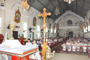Đúng 18 giờ các em thiếu nhi đã có mặt tại Nhà Thờ để chuẩn bị bước vào giờ Chầu Thánh Thể thật trang nghiêm và sốt sắng. Hầu hết các em thiếu nhi có hoàn cảnh đặc biệt không phải là người Công giáo, nhưng các em được hướng dẫn gặp gỡ Chúa Giêsu Thánh Thể như gặp gỡ với một Người thân tình và gần gũi với các em. Các em đã dâng lên Ngài những ý nguyện đơn sơ nhưng vô cùng ý nghĩa “xin cho thế giới luôn hoà bình, cho các trẻ em có hoàn cảnh đặc biệt luôn được yêu thương, chăm sóc, cha mẹ các em được nâng đỡ ủi an…” Các em cũng không quên cầu cho những vị ân nhân đã âm thầm giúp đỡ các em qua các chương trình bác ái.