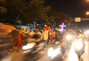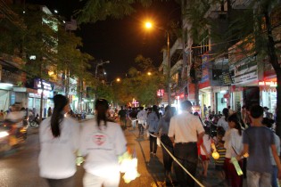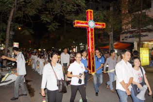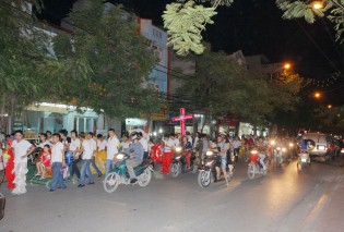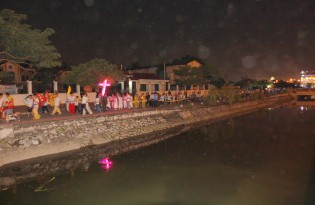 Sau giờ Chầu Thánh Thể là chương trình rước đèn Trung Thu hết sức sôi nổi và đặc sắc. Đi đầu là đội Múa Lân Giáo xứ Xâm Bồ, Đội Trống của Giáo xứ An Hải, tiếp đến là Thánh giá nến cao, các em được xếp hàng đôi, vui tung tăng cầm trên tay những chiếc đèn lồng, được làm bởi bàn tay khéo léo của các thành viên Nhóm Ve Chai Nhân Ái, Nhóm Sinh viên Công giáo, các anh chị Giáo lý viên dành tặng các em. Anh Vinh Sơn Nguyễn Thế Việt, thành viên Nhóm Ve Chai Nhân Ái chia sẻ: “để tạo thành một chiếc đèn lồng đẹp mắt và hấp dẫn như thế này, phải trải qua rất nhiều công đoạn, từ việc lựa chọn nguyên liệu, cho đến làm khung, bọ lồng, trang trí hoa văn… Tất cả đều mong muốn dành tặng các em những chiếc đèn lồng đẹp nhất.” Như thế những chiếc đèn không còn là những vật vô tri nhưng kết tinh trong đó bao tấm lòng yêu mến dành cho các em. Cùng ngọn nến lung linh toả sáng với đủ màu sắc khác nhau, như muốn truyền tới các em bao niềm hy vọng trong đêm Trung Thu này. Trên khuôn mặt của từng em lộ rõ niềm vui và hạnh phúc. Em Nguyễn Thị Huyền T 9 tuổi trẻ ảnh hưởng bởi HIV/AIDS vui mừng nói“Chúng em rất vui vì được tham dự chương trình rước đèn ông sao thật đẹp,em mong đêm Trung Thu nào cũng được đến Nhà Thờ mừng Tết Trung thu”.