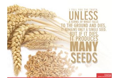 Con đường Chúa Giêsu đã đi qua là con đường hạt lúa: "Đã đến giờ Con Người được tôn vinh. Thật, Thầy bảo anh em, nếu hạt lúa gieo vào lòng đất mà không chết đi, nó vẫn trơ trọi một mình. Còn nếu nó chết đi, nó mới sinh được nhiều hoa trái" (Ga 12,23-24).