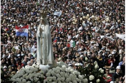 The statue of Our Lady of Fatima is carried May 13 through a crowd of pilgrims at the shrine built in her honor in central Portugal. Hundreds of thousands of pilgrims joined in celebrations marking the 90th anniversary of the first apparition of the Vir gin Mary to three shepherd children. Lucia dos Santos and her cousins, Francisco and Jacinta Marto, received the first of several visions of Mary May 13, 1917. CNS photo/Nacho Doce, Reuters