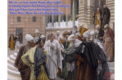 Bài Phúc Âm hôm nay kể về phái Xa-đốc không tin có sự sống lại, họ đặt ra những vấn nạn vô lý để chất vấn Chúa Giê-su. Họ trích sách Ðệ nhị luật 25, 5-6 để hỏi Người: Nhà kia có 7 anh em trai. Người anh cả cưới vợ rồi chết không con. Theo luật Mô-sê, người em phải lấy chị goá để có con nối dõi, và cả 7 anh em đều chết không con. Khi sống lại, chị goá đó vợ sẽ là của ai? Họ đưa ra ví dụ mà chẳng thể xảy ra trong thực tế. Trong thế giới mai sau, bà vợ thuộc về ai trong số 7 ông chồng? Chẳng lẽ 7 ông đánh nhau để dành 1 bà trên thiên đàng? Kiểu lý luận hàm ẩn một quan niệm, thế giới mai sau cũng như hiện tại, nối dài hiện tại. Người Việt Nam cũng vậy, thói quen đốt vàng mã, đốt đôla, đốt xe honda, đốt nhà lầu…cho người cõi âm xài…Người ta tin rằng thế giới mai sau cũng giống như thế giới mình đang sống cho nên người đã chết cũng cần xe, cần tiền…
