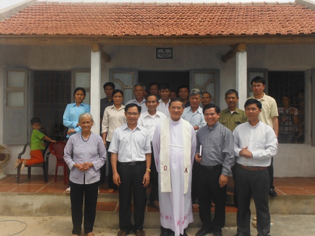 Đức Cha Tôma và phái đoàn Caritas trước ngôi nhà mới của bà Trần Thị Nhị