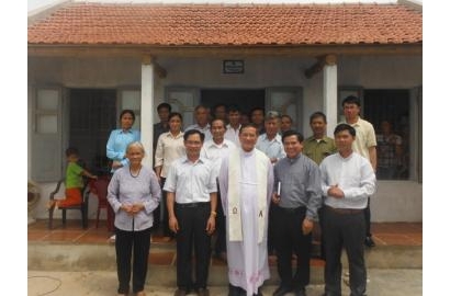 | Đức Giám mục Tôma Vũ Đình Hiệu, quý Cha Caritas cùng các ban chụp hình lưu niệm trước ngôi nhà cấp 4 được trao tặng cho bà Dần |