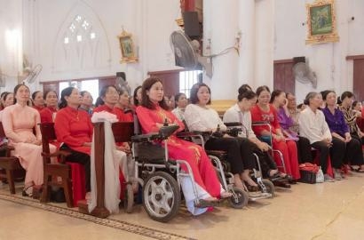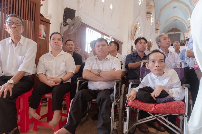 Giữa dòng người, tôi bắt gặp một người chồng nhỏ bé nhưng đầy nghị lực, cõng vợ bại liệt từ ngoài cổng vào tận trong nhà thờ. Người vợ thì khẽ lau mồ hôi trên trán chồng. Hình ảnh ấy khiến tôi rưng rưng. Ở một góc khác, một anh ngồi lọt thỏm trong chiếc xe lăn đã sờn rách, đôi mắt rực sáng khi chăm chú nghe bài giảng. Rồi một chị mất một chân, chậm rãi bước đi nhờ vòng tay nâng đỡ của các dì Caritas, nụ cười của chị bừng sáng như ánh đèn soi vào niềm tin.
