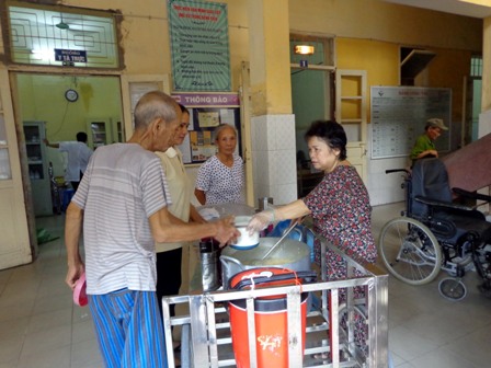 Hôm nay tôi mới có dịp để thực hiện bài phóng sự ngắn này.Tôi theo chân các chị “Nồi cháo bác ái” đi hết lượt các phòng bệnh nhân khoa Truyền nhiễm; sau đó lại đi thang máy để lên tầng 5 và tầng 6 của bệnh viện Việt Tiệp. Không còn thấy các y bác sỹ đi lại khám bệnh hay cấp phát thuốc. Bầu khí trong các phòng bệnh có vẻ thoải mái, đầm ấm và dễ chịu hơn. Đó cũng là lúc những người trong nhóm bắt tay vào công việc của mình. Bệnh nhân, người nhà phục vụ bệnh nhân và nhóm người làm công tác bác ái này, họ như đã quen nhau từ lâu.