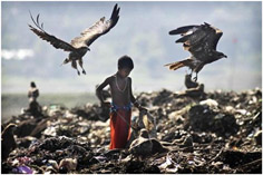 Trẻ đường phố kiếm sống tại bãi rác ở Gauhati, Ấn Độ. Bức ảnh chụp ngày 19-11, một ngày trước khi Liên Hiệp Quốc kỷ niệm 60 năm ra tuyên ngôn về quyền trẻ em và 30 năm công ước quốc tế về quyền trẻ em. Ảnh: Anupam Nath |