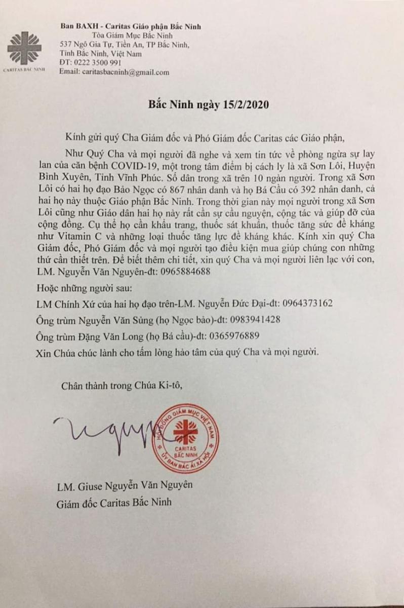 Cha đặc trách Caritas Giáo phận Bắc Ninh đã có lời kêu gọi xin giúp giáo dân trong hai giáo họ Bảo Ngọc và Bá Cầu thuộc giáo xứ Hữu Bằng đang bị cách ly giữa tâm dịch xã Sơn Lôi, huyện Bình Xuyên, tỉnh Vĩnh Phúc.